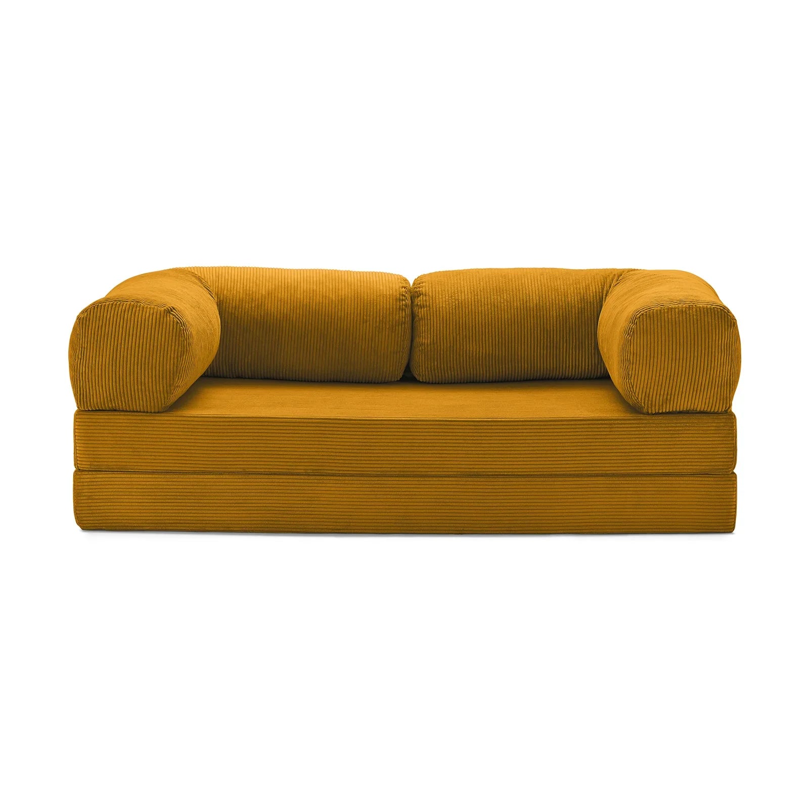 Canapé 2 places en velours côtelé couleur moutarde, livré dans un carton compact. Teinte rétro-chic, montage rapide, confort ferme et design contemporain.